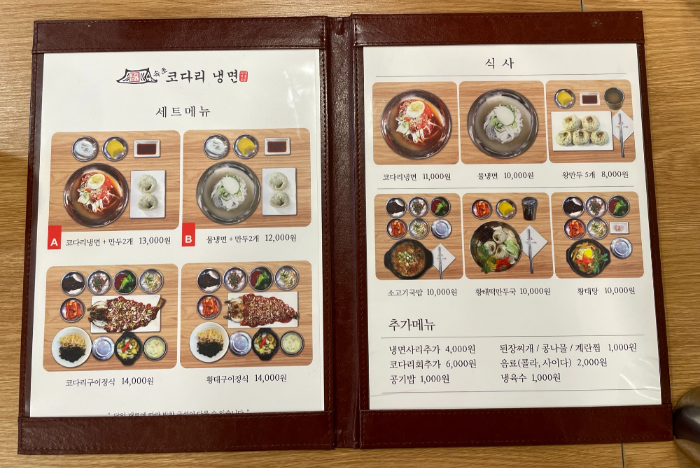 우리가 주문한 메뉴는 세트A(코다리냉면+만두2개)(13,000원)와 코다리구이정식(14,000원)이다.
