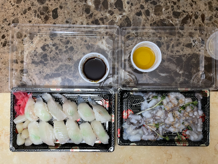 포장해 간 음식음 활어초밥과 산낙지(20,000원)!