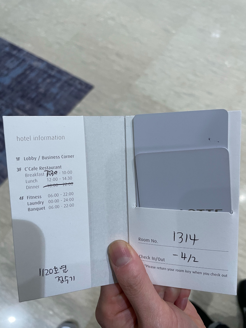 프론트에서 예약번호를 말하고 수령한 객실키..(2장)