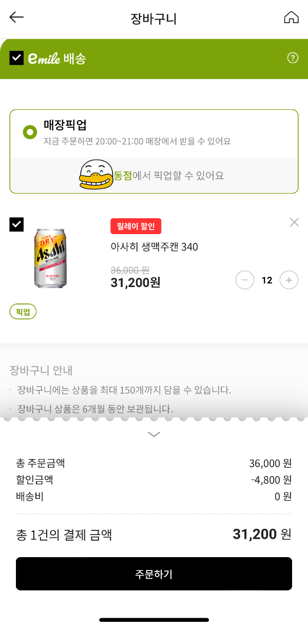 구매하기 버튼을 누르면 장바구니가 나오는데, 나는 12캔을 담았다.