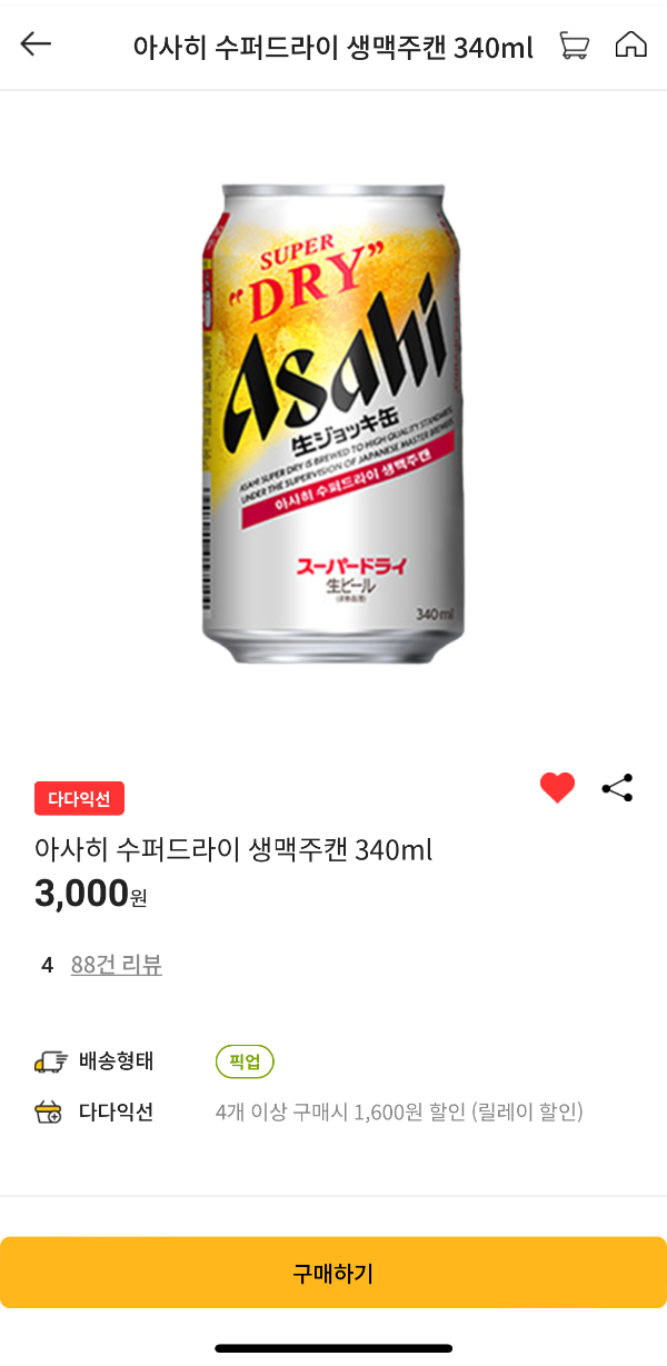 이마트 앱에서 아사히 수퍼드라이 생맥주캔을 검색한다.