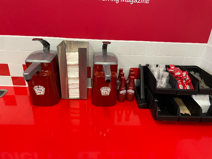 제품 수령하는 곳 옆에 케첩 및 일회용품이 있어서 쉽게 포장을 할 수 있도록 준비가 되어있다.